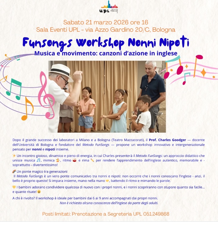 On Saturday, 21 March 2026, at 16:00Primo Levi University in Via Azzo Gardini, Bologna, will host the fifth edition of the lively NonniNipoti Workshop, led by Charles Goodger.
